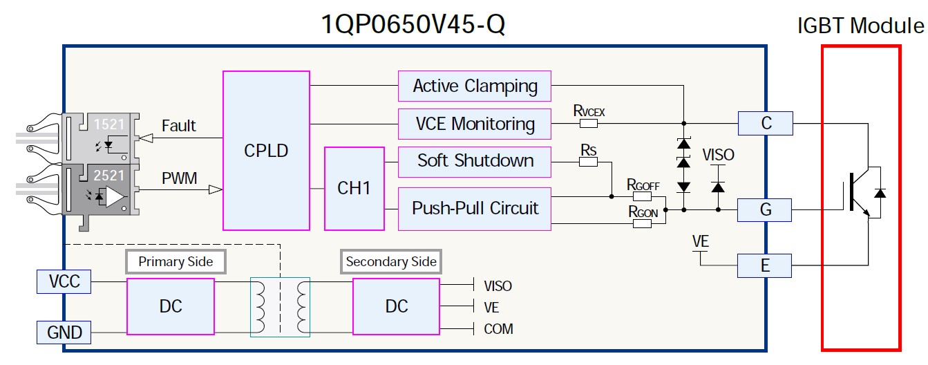 1QP0650V45-Q is a single channel, high power, high insulation voltage, compact driver composed of our ASIC chipset and CPLD chip design. It is designed for IGBT modules with crimping package below 4500V. The drive core board is fixed on the power unit shell or specially designed fixed base.
