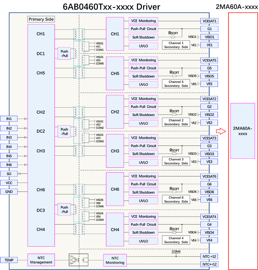 6AB0460Txx-xxxx is a I-type three-level, six-channel, medium  power, high isolation voltage, compact, high-reliability driver designed for medium power, high reliability applications based on BronzeTechnologies’ ASIC chip.