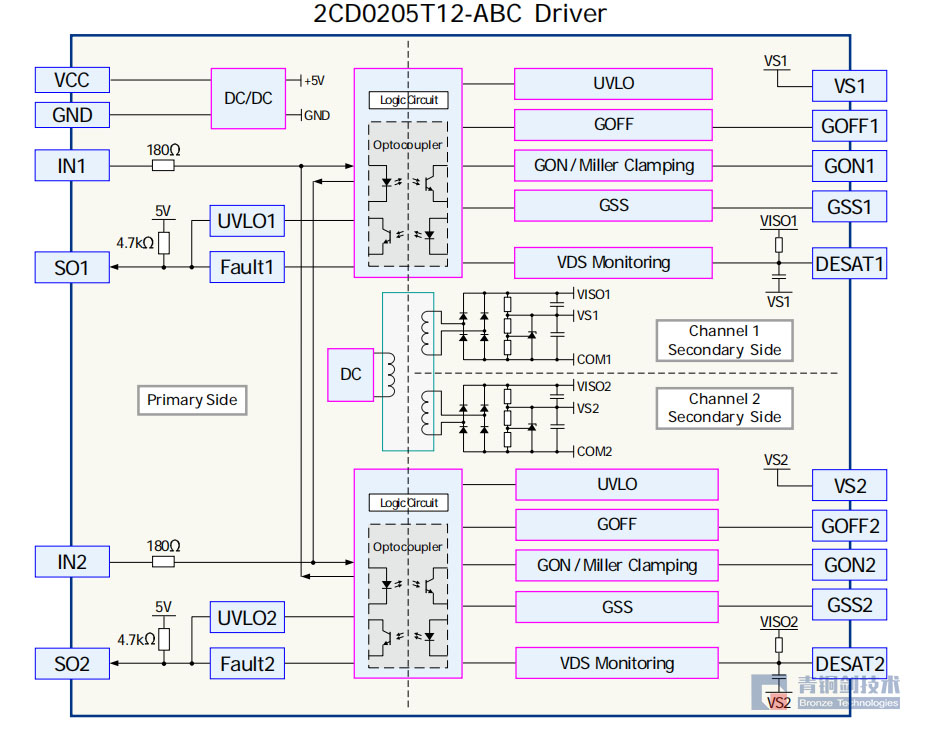 針對碳化硅功率器件的市場需求,青銅劍技術基于光耦隔離驅動方案,設計了一款雙通道、緊湊型驅動核2CD0205T12-ABC,可應用于空間有限、中低壓和高可靠性領域。