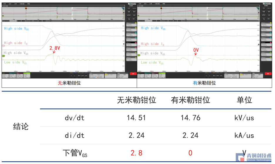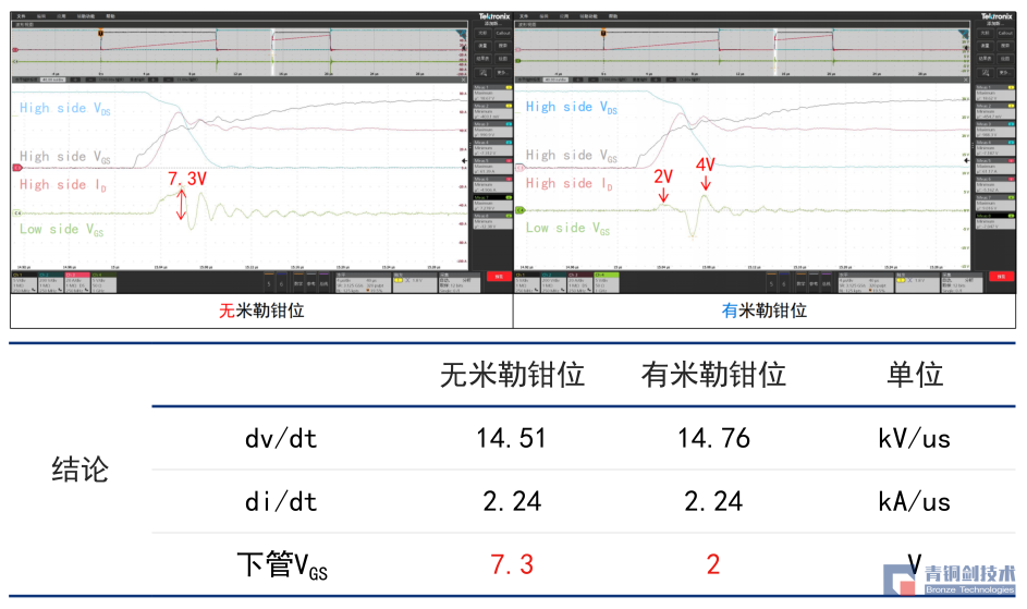 米勒鉗位原理是通過一個低阻抗回路泄放掉米勒電流。在IGBT中,因為IGBT的開關速度相較于碳化硅MOSFET要低,且門檻電壓相較于碳化硅MOSFET要高,所以通常不需要此功能。下圖為實際使用BTD5350芯片搭建的驅動,搭配由碳化硅MOSFET組成的橋式電路的有無米勒鉗位功能的對比波形。