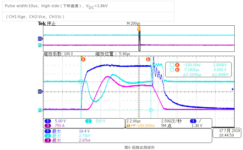 在1.8kV母線電壓,下橋臂直通的條件下,能夠檢測到IGBT退飽和并對其進行保護,且高級有源鉗位功能被觸發,Vce關斷尖峰有效的抑制在2.73kV。